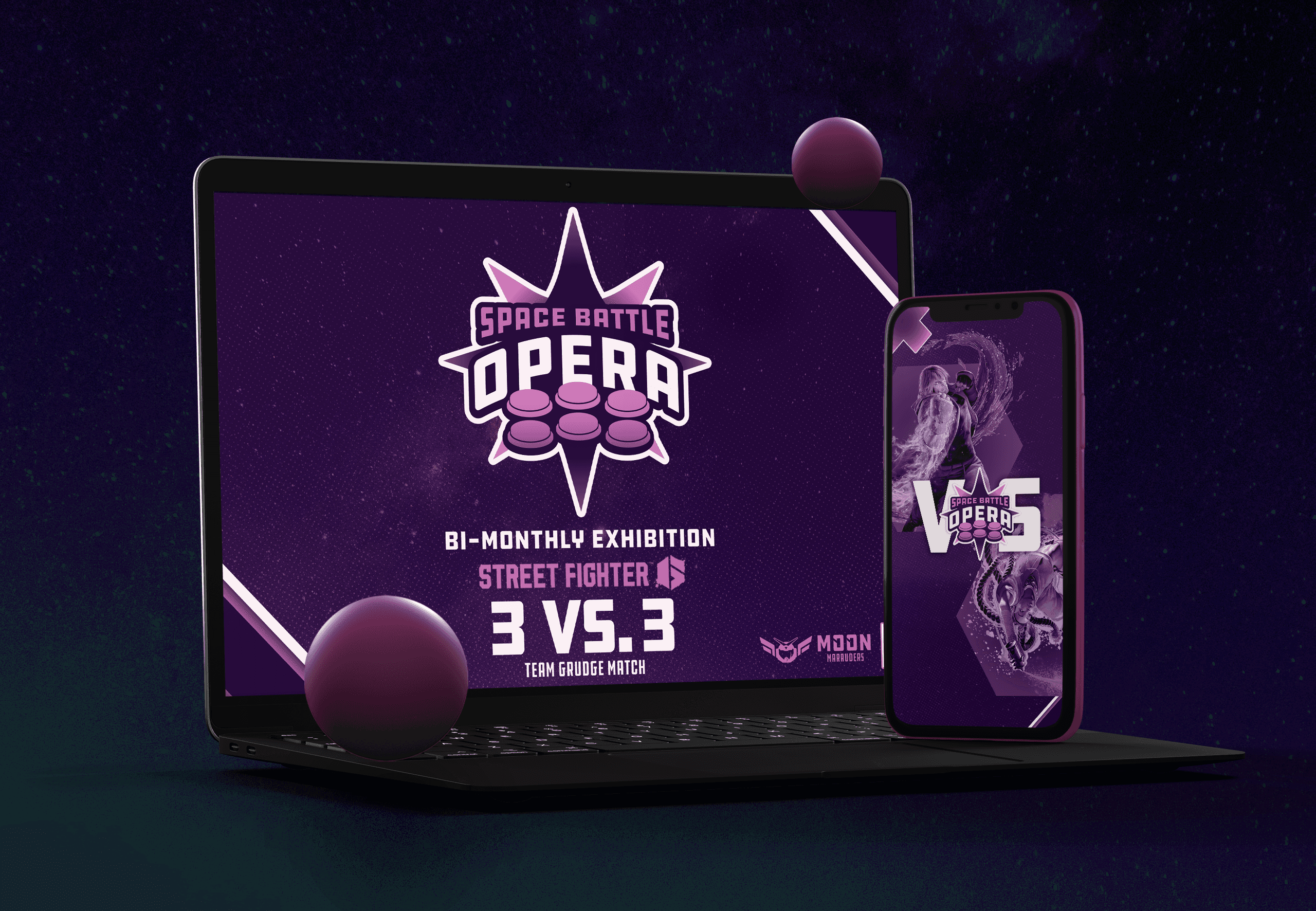 A laptop and phone side-by-side highlighting the Space Battle Opera event design across platforms.