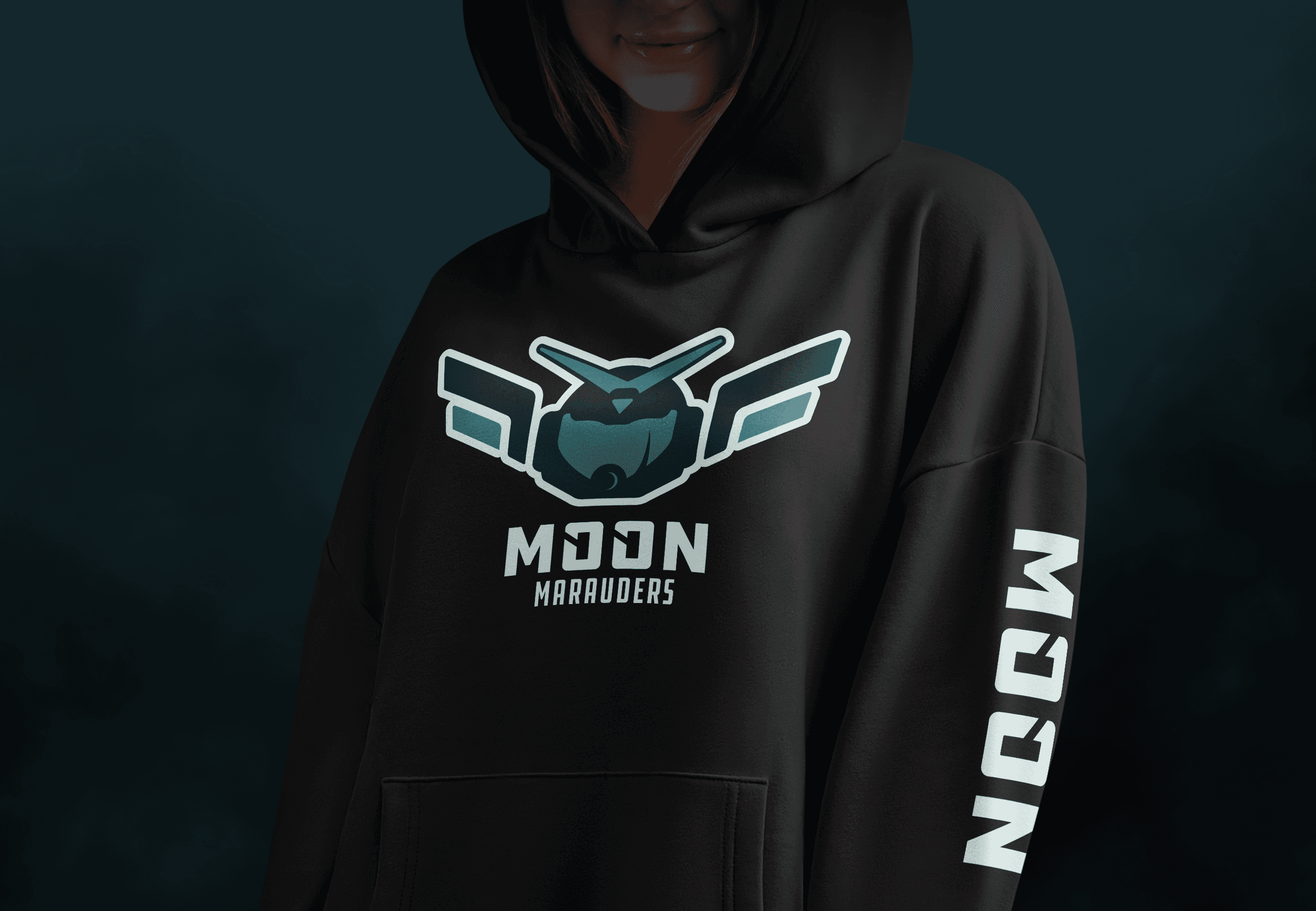 A hoodie mockup featuring the Moon Marauders design—bold, futuristic graphics inspired by lunar exploration and space-fighter aesthetics.
