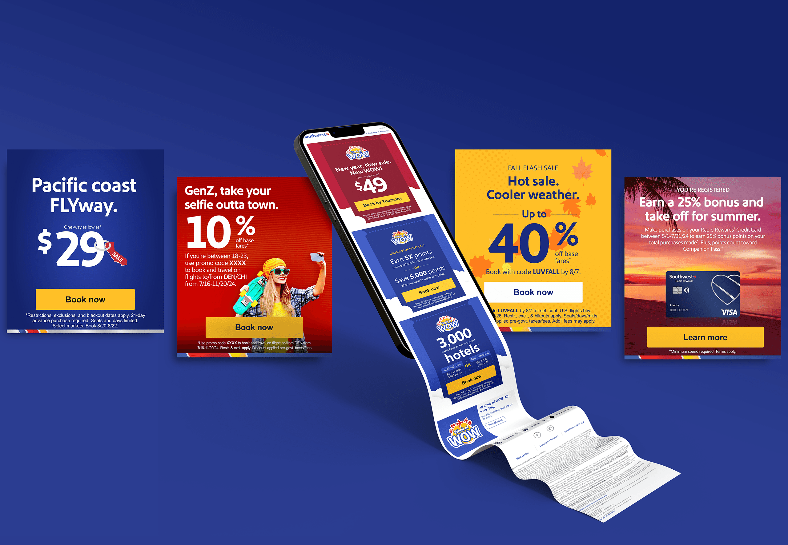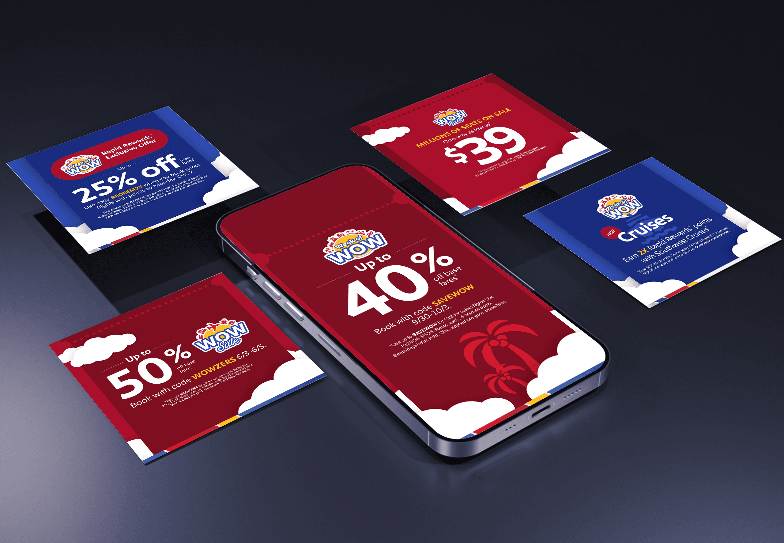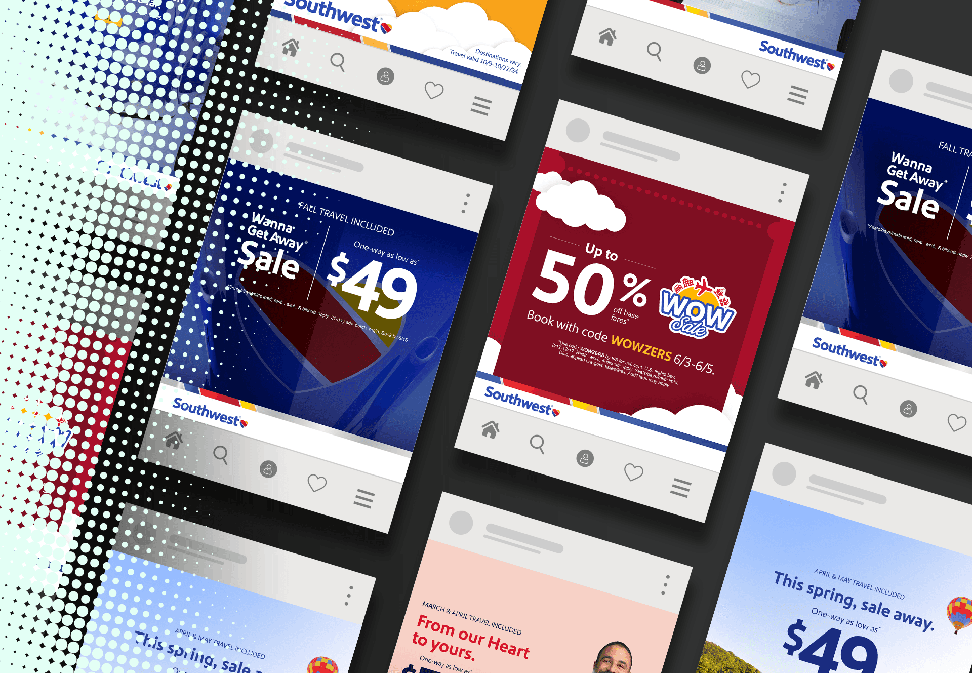 My solution was to create a structured yet flexible design system that balanced creativity with consistency. I streamlined templates for campaigns, sales, and internal communications—making it easier for teams to produce on-brand materials quickly. By leading cross-functional collaboration, I ensured every piece of creative aligned with Southwest’s tone and visual language, while still leaving room for fresh ideas and bold design moments.