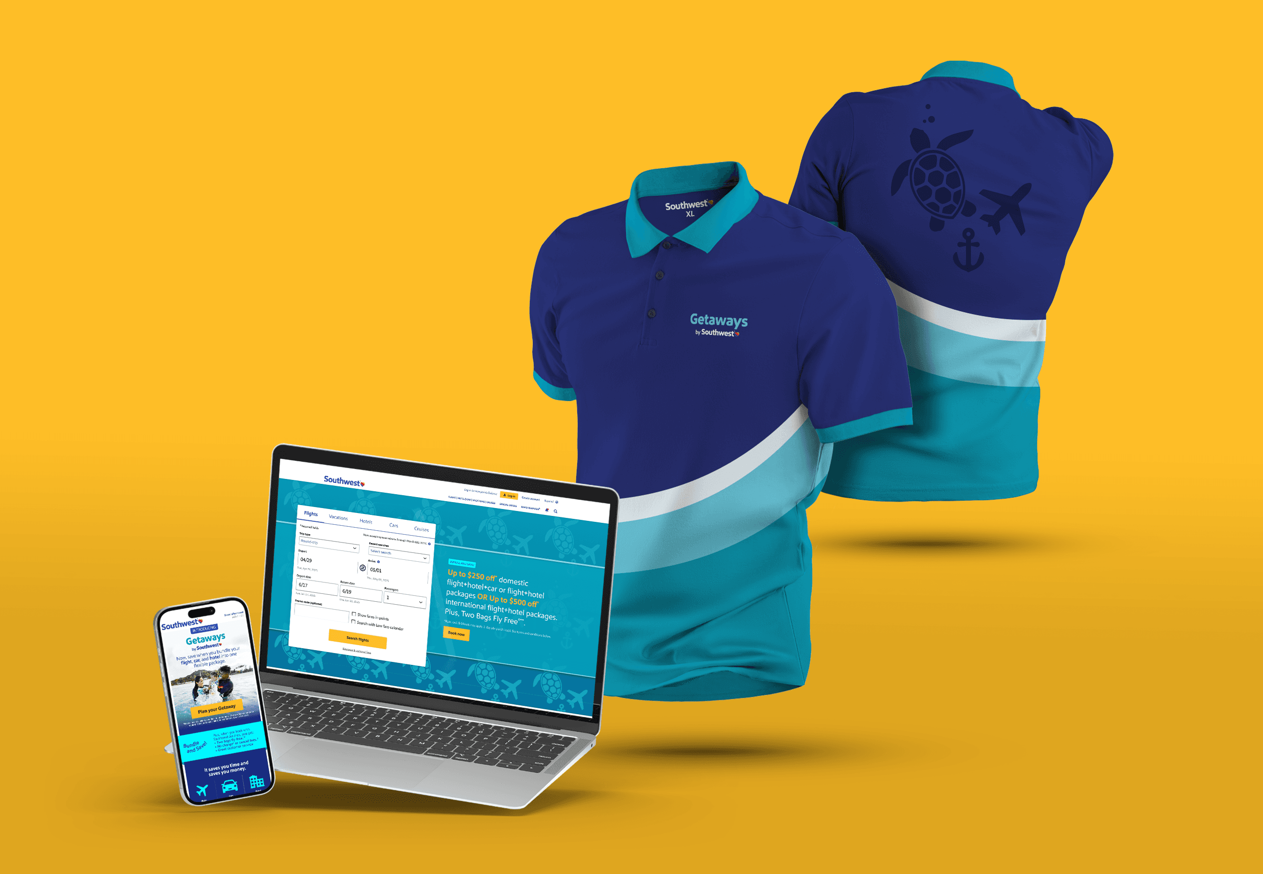 A vibrant Southwest Getaways campaign mockup showcasing a custom-designed polo alongside laptop and mobile product launch visuals, merging lifestyle storytelling with clean, bold typography to inspire travel while supporting a seamless multi-platform rollout.