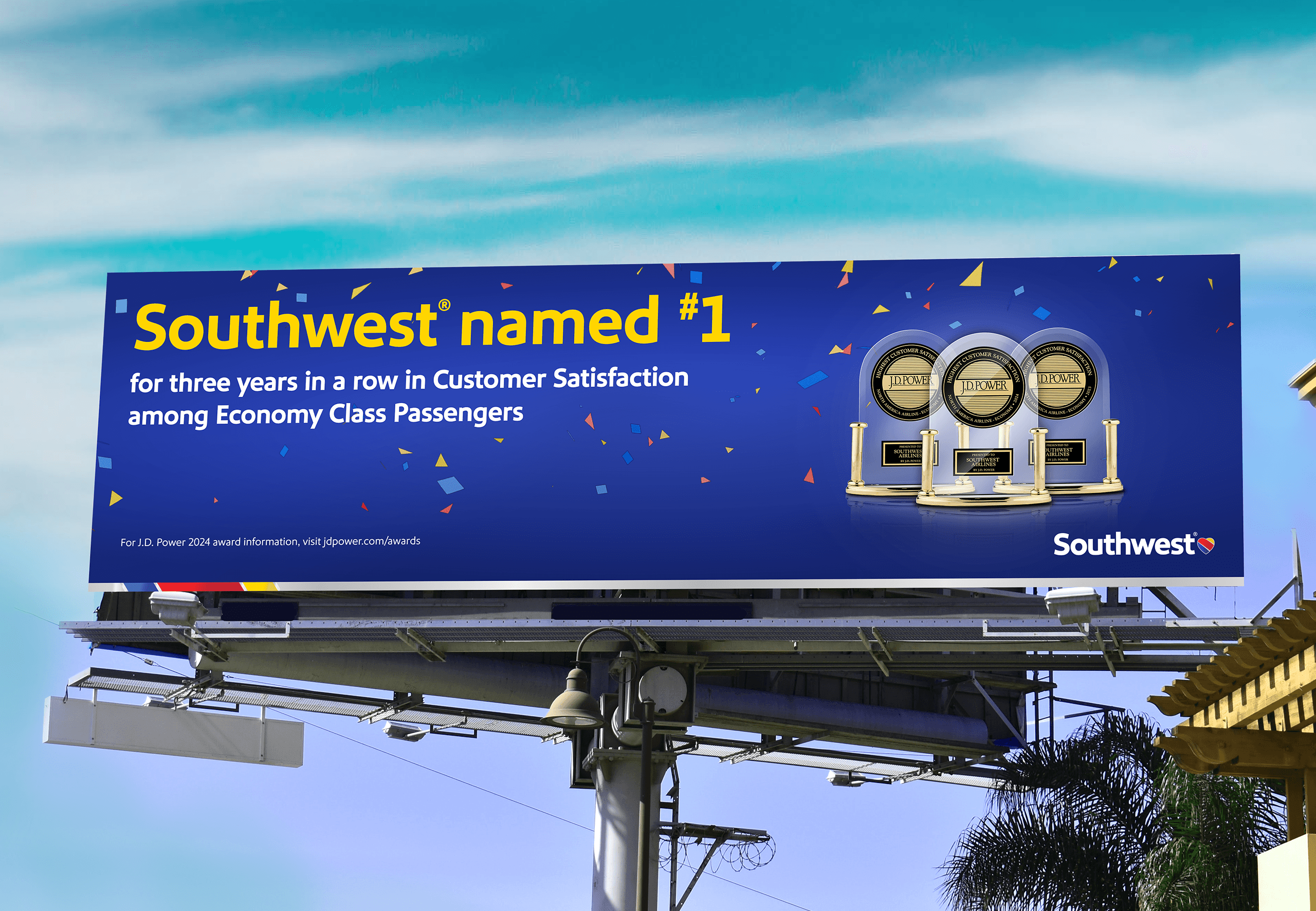 A bold Southwest Airlines billboard celebrating the J.D. Power award for #1 Economy Brand, featuring striking visuals, confident typography, and the iconic Southwest heart to emphasize pride and recognition.